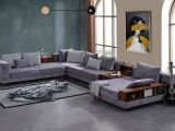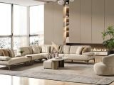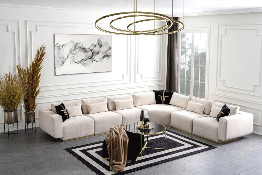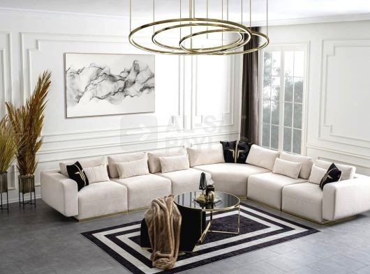 Açık ton kumaşlarla kombine edilmiş, düz hatlı, metal ayaklı L koltuklar — hem ferah hem zarif bir hava katıyor.