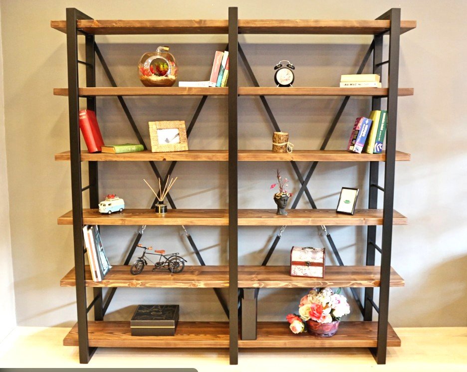 Bu rustik kitaplık ve bölme paneli, dekoratif bir görünüm ile fonksiyonelliği birleştirir. Ahşabın sıcaklığı ve metalin sağlamlığıyla oluşturulan bu kombin, her mekânda endüstriyel bir şıklık yaratır.